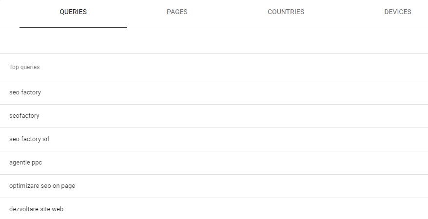 In sectiunea de Performance sau Search Results (sub graficul de performanta) poti vizualiza ce cuvinte cheie au adus clienti pe pagina ta, precum si pe ce pagina de site. Aceste cuvinte cheie se monitorizeaza si se coreleaza in timp. Fara o implementare rapida a Google Search Console (GSC), aceste date nu vor putea fi analizate.