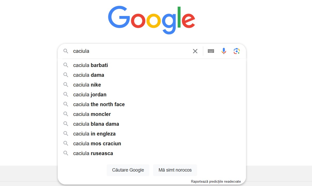 In motorul de cautare Google incepi sa scrii ceea ce consideri ca potentialii tai clienti cauta, iar Google iti va oferi finalul sintagmei, precum si alte variante care sunt cautate. Dezavantajul este ca nu iti ofera si un volum exprimat in cifre al cautarilor pe care le au cuvintele cheie respective.