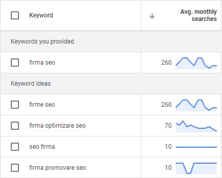Pentru agentiile de marketing digital care ofera servicii de Google Ads, aceste volume de cautari sunt mai specifice in Keyword Planner, deoarece au acces la un cont de business. Mai jos se poate vedea ca „firma SEO” are 260 de cautari pe luna.