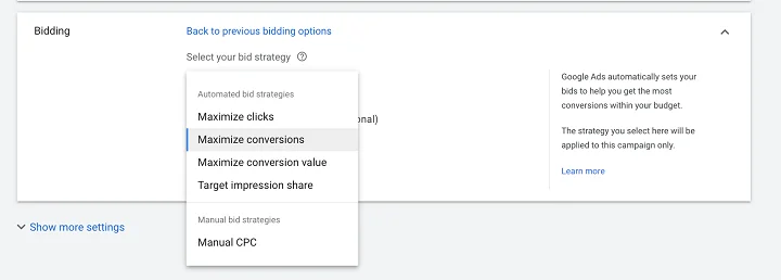 Maximize conversions este o strategie de licitare automatizata care seteaza automat licitarea pentru a obtine cat mai multe conversii in limita bugetului alocat. Aceasta strategie de licitare se poate utiliza cu sau fara o limita maxima de licitare pentru o conversie.