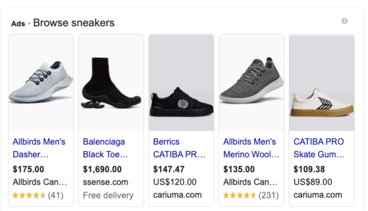 Anunturile de Shopping apar deasupra sau alaturi de rezultatele de cautare organice pe Google, oferind o vizibilitate excelenta. Ele apar si in sectiunea ”Cumparaturi” de pe Google, unde utilizatorii pot cauta si compara produse.