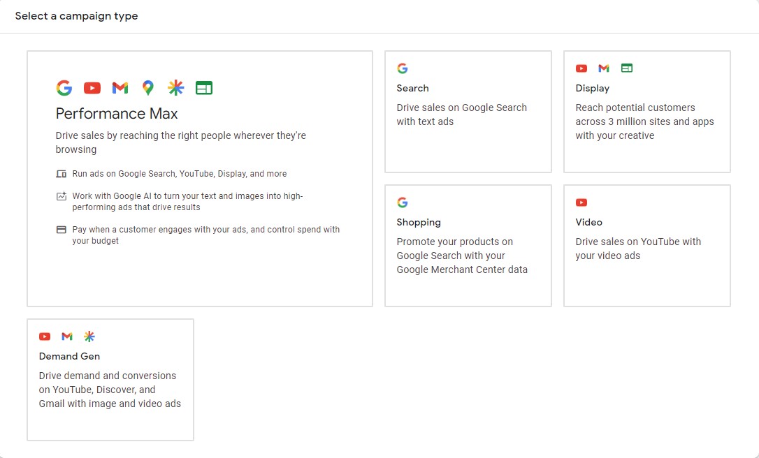 In continuare, ne vom referi la campaniile de Search (cautari), Display, Shopping (cumparaturi), Video, Demand Gen (de generare a cererii) si Performance Max.